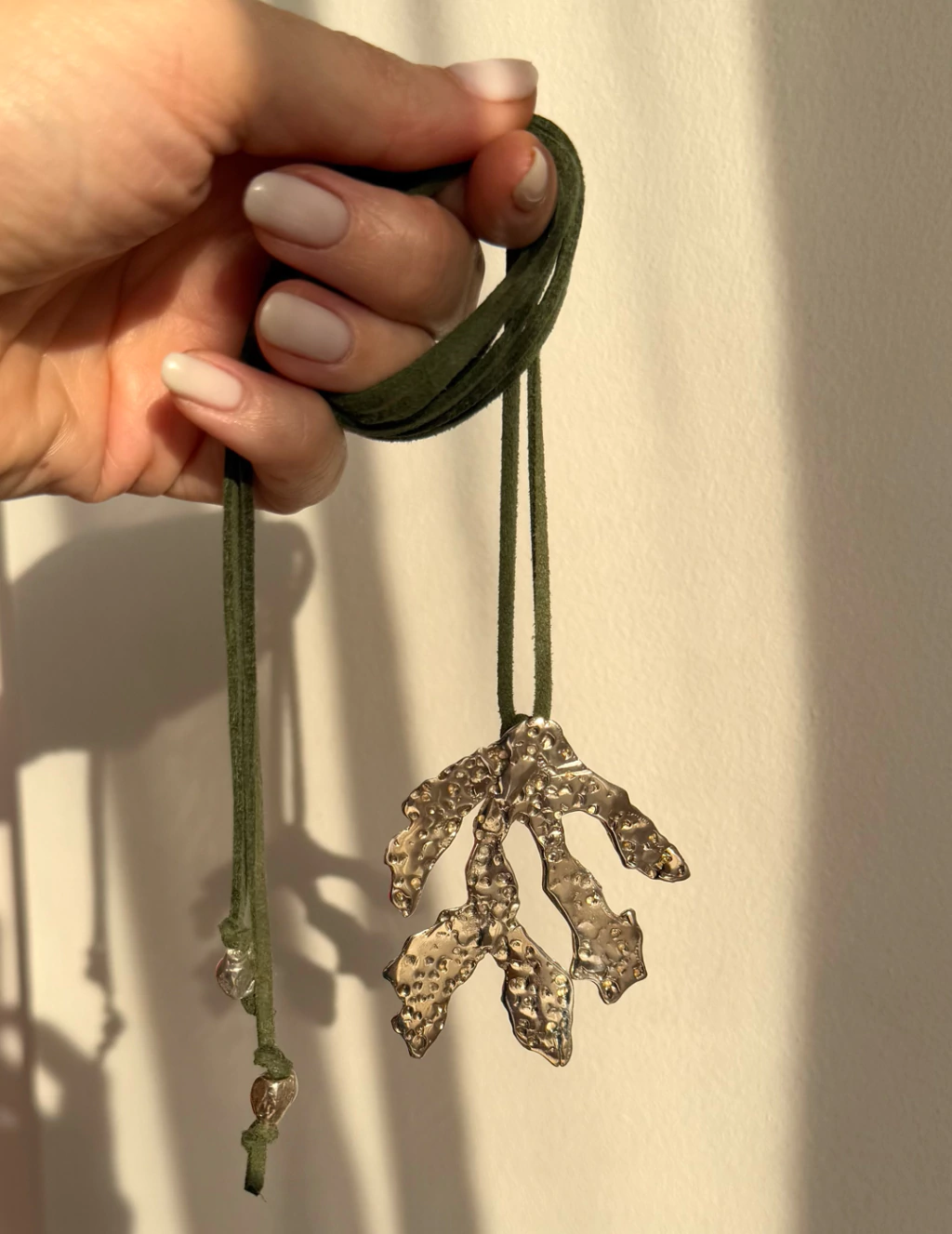 Collar con dije de bronce hecho a mano y baño de plata, cordón de gamuza y terminales de bronce bañado en plata.
